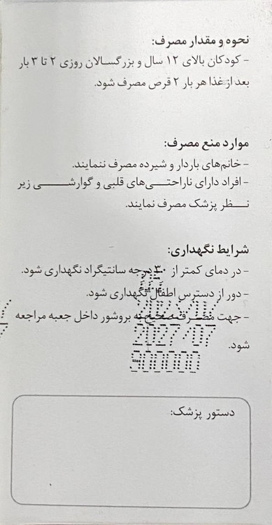 مقدار مصرف: روزی سه مرتبه ۲ الی ۳ قرص بعد از غذا